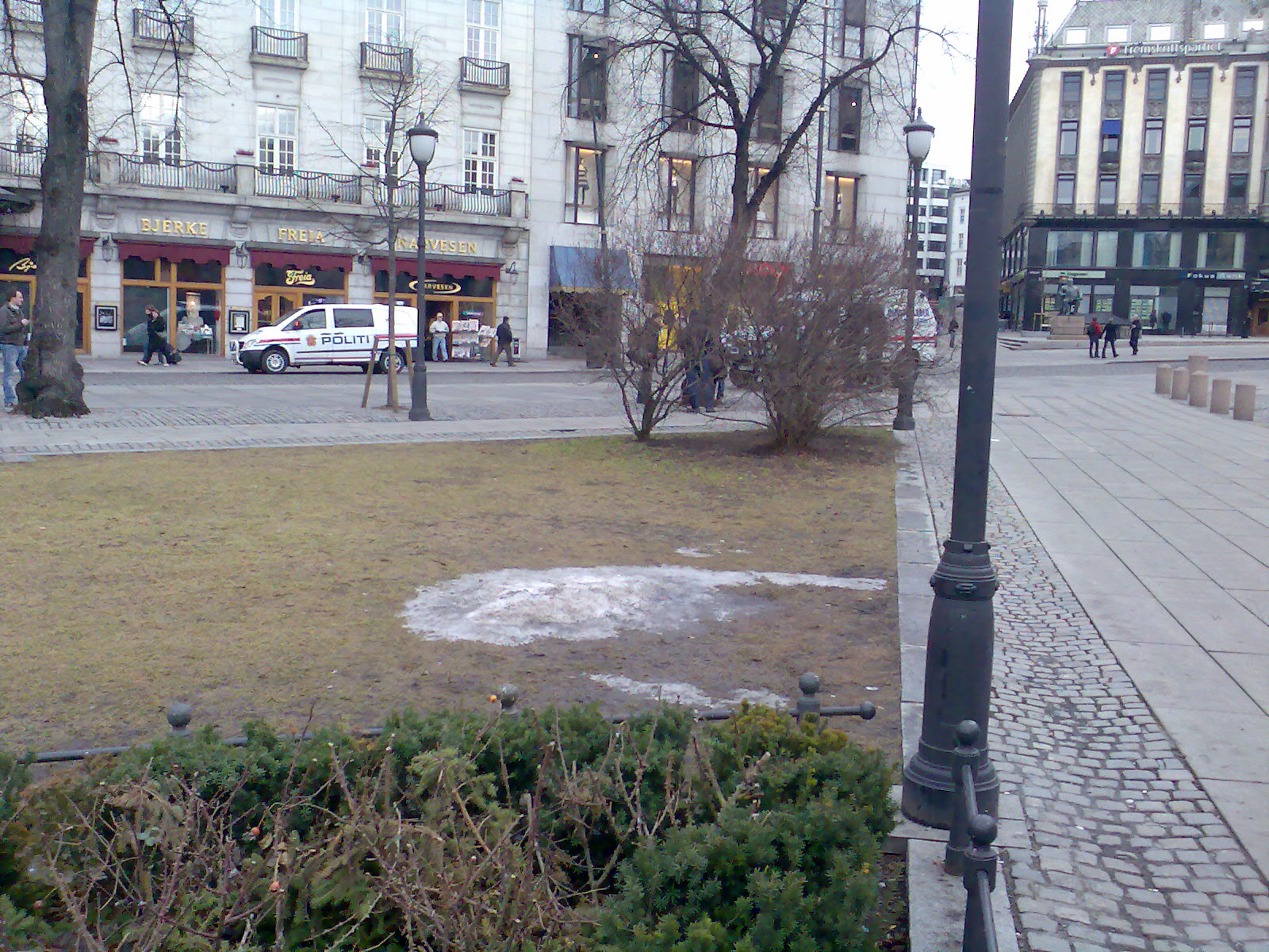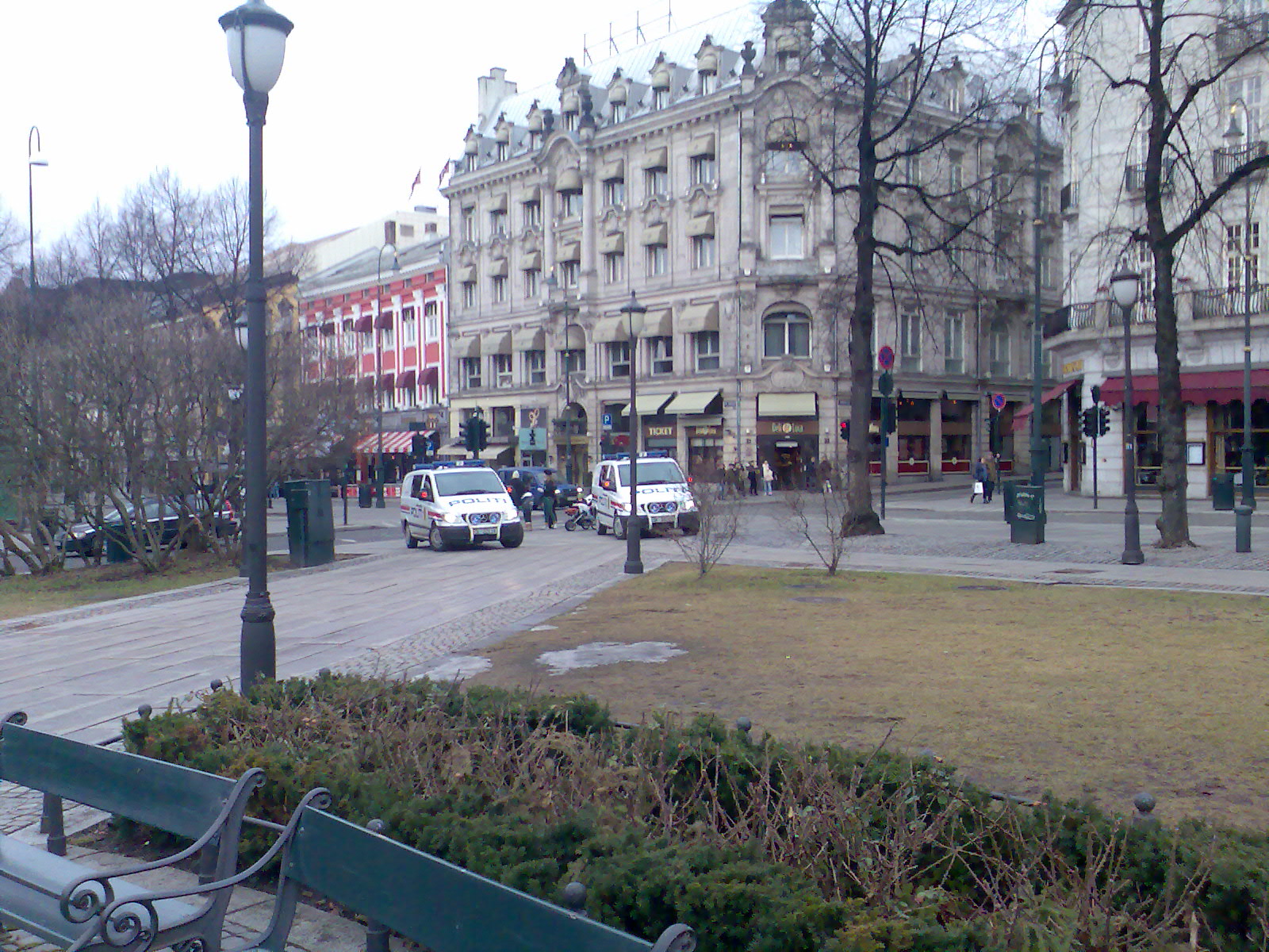 Om det var dårlig presseombud, var det desto bedre oppbud fra politiet. Jeg tror vel aldri jeg har sett så mange politibiler passe på så få mennesker i Oslo noengang. På det meste var vel det lille fredelige toget omringet av fem-seks politibiler…