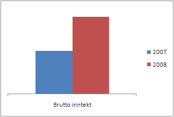 2008 har vært mitt første år som fulltidsansatt gjennom et helt år, og har derfor naturlig nok vært preget av mye jobbing og lite ferie. Det har gitt noe utslag på inntekten sammenlignet med ifjor hvor jeg jobbet deltid som student 3/4 av året, men de økte utgiftene i Oslo by (spesielt som singel siste halvåret) og nedbetaling av studielån har spist opp dette og vel så det. Jeg har ikke noen graf over utgiftene, men at det er godt over 100% økning er det ihvertfall ingen tvil om (mens inntekten har økt med ca. 79,5%).
